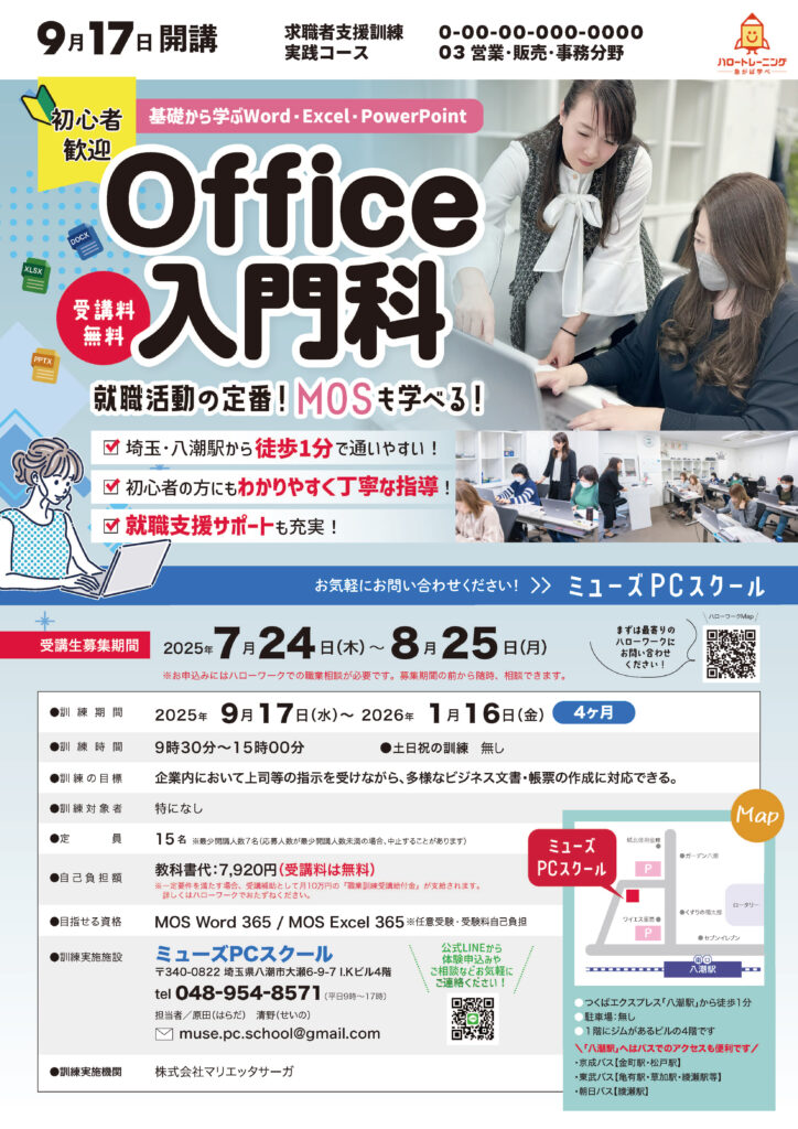 2025年9月17日(水)開講の「Office入門科」の申込みがいよいよ開始されます。パソコン操作を覚えたい求職者の方は是非ご検討してみてくださいね。分からないことがありましたらお気軽にお問い合わせください!<Office入門科>●訓練期間:2025年9月17日(... -